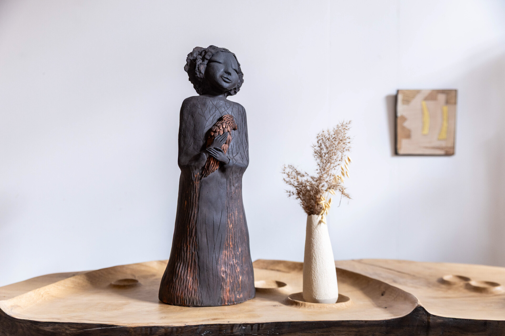 Les créations d’Olivier Bertero convoquent une antiquité contemporaine où se croisent civilisations réelles et imaginaires, donnant naissance à des figures féminines puissantes et oniriques. Catherine Giroud (Ciem) traduit en Raku une sensibilité libre et sensuelle, où l’expérience intime se mêle à une quête poétique. Inspiré par ses voyages et ses rencontres, Christian Lionnet façonne des portraits vibrants d’ethnies africaines, empreints d’âme et de mémoire. Béatrice Pothin Gallard révèle, à travers ses bronzes, l’élégance intemporelle du corps vivant, capturant le mouvement et la grâce. Vincent Tournebize inscrit dans la terre la vitalité des postures féminines, célébrant la fécondité et l’authenticité des gestes. Enfin, Marie-Hélène Vallade-Huet modèle des personnages sobres et poétiques, marqués par la gravité et la rêverie.