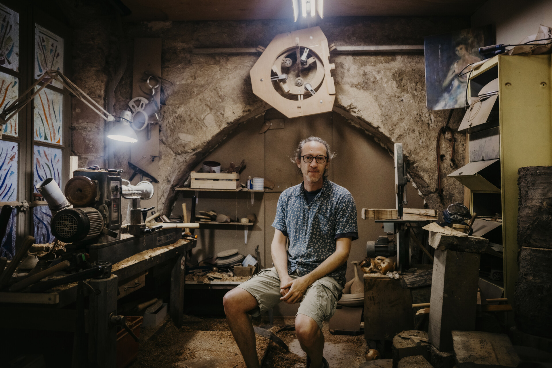 Inspiré par l’art de son père et après un long cheminement aussi varié que riche, Bruno Bergamasco s’installe dans son atelier à Pézenas en 2020. Tourneur sur bois, il privilégie les essences locales, telles que le buis, le cade ou le micocoulier et crée des pièces uniques : objets d’art de la table, luminaires ou encore sculptures. Attaché à une pratique respectueuse de l’environnement, il travaille exclusivement des bois de récupération, déjà tombés ou voués à l’être, fournis par des bûcherons ou des élagueurs du territoire. Il s’inspire du Kintsugi, cet art japonais qui magnifie les fêlures des porcelaines en les soulignant d’or. De la même manière, plutôt que de dissimuler les fissures naturelles du bois, Bruno Bergamasco les valorise et les sublime en y intégrant des minéraux – comme la turquoise – ainsi que des métaux tels que le bronze, l’aluminium ou l’étain.