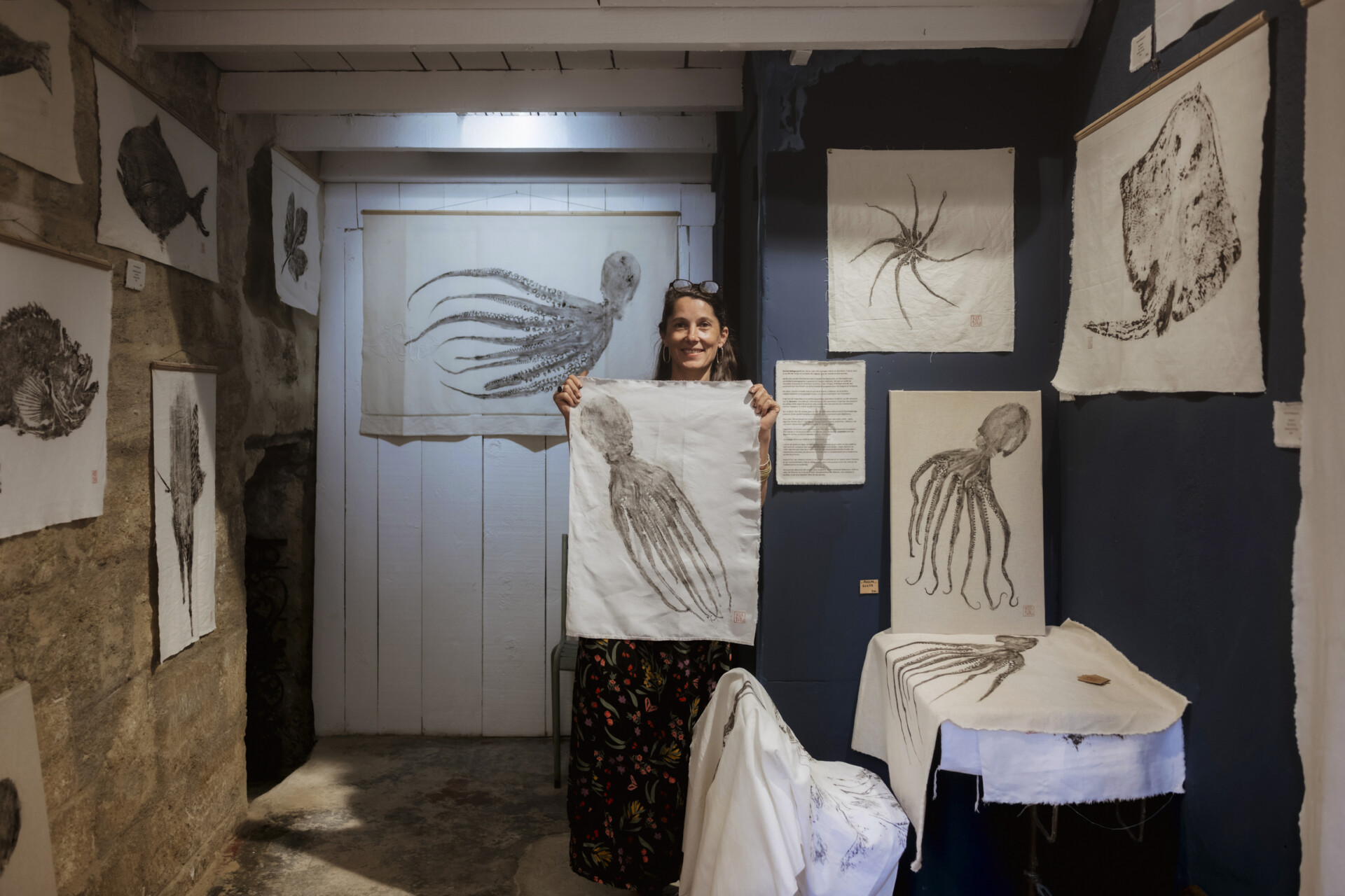 Après trois années d’immersion dans l’univers des Beaux-Arts et de nombreux voyages inspirants, Dorine Hellegouarch s’installe dans son atelier-boutique de créations textiles - Atelier TOKO - à Pézenas, en 2008. Elle se passionne pour le Gyotaku, technique japonaise d’impression à l’encre de seiche utilisée à la fin du XIXe siècle par les pêcheurs pour conserver l’empreinte de leurs plus belles prises. Dorine réinvente cette pratique en l’étendant au monde végétal, offrant ainsi une nouvelle poésie à cette méthode traditionnelle. Amoureuse de la matière textile, elle sélectionne avec soin des tissus anciens — cotons, chanvres, lins, métis. Ses créations, empreintes de délicatesse, invitent à interroger le lien intime entre l’être humain et son environnement.