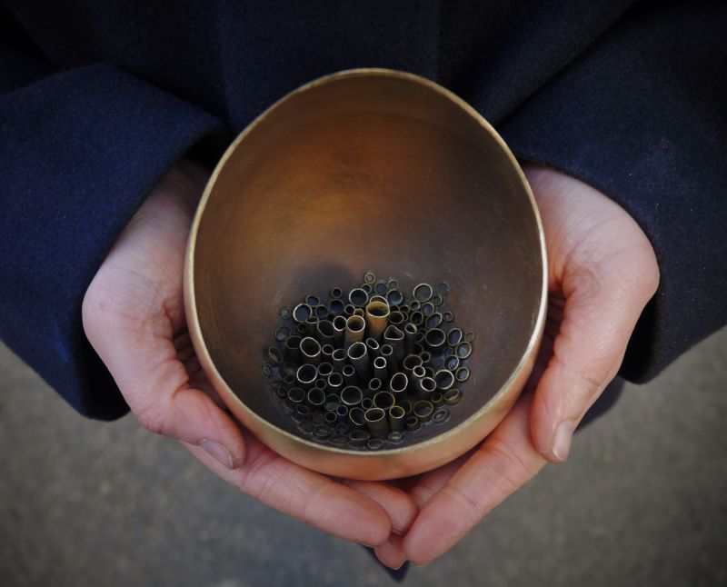 « La mise en forme des matériaux tient une place centrale dans ma pratique. J’aime fusionner les techniques et les matières ; le textile se conjugue au métal. Par la broderie et l’enluminure sur métal, une poésie visuelle se dessine. Les objets que je crée sont les témoins d’un récit ou d’une mythologie personnelle. »