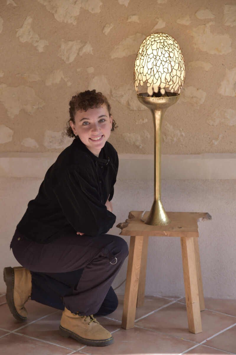 Du 10 au 14 septembre 2026, c'est Adèle Goulet, dinandière et brodeuse, qui présentera ses créations sous la verrière du Hall 5A de Maison&Objet. La créatrice mêle ferronnerie, dinanderie et textile brodé pour concevoir ses luminaires. Chaque pièce présente une structure ajourée inspirée des membranes microscopiques. Les tiges de cuivre sont brasées au laiton puis dinanderées pour une rondeur naturelle, tandis que le textile apporte un écho poétique aux « tissus cellulaires » qui nourrissent son univers.